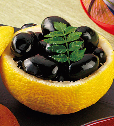 黒豆の中でも高級品といわれる丹波産の黒大豆(黒豆)を、ほの甘く炊き上げたやわらかい煮豆。