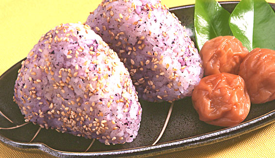 ※『しそふりかけ』のおむすびを作り、最後に『梅ごま』をまぶしてみました。